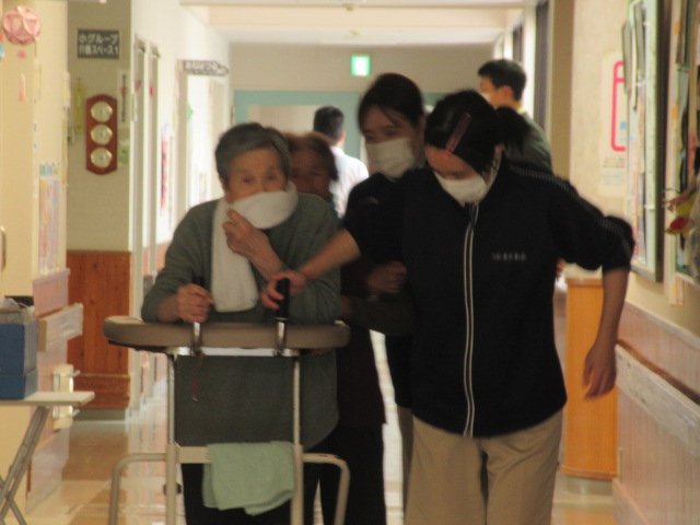 夜間想定の避難訓練を行いました。 地域協力員のみなさんが来るまでは夜勤者二人で避難誘導するという想定です。